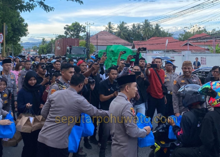 SEPUTARPOHUWATO.COM – Aksi humanis ditunjukkan Kapolda Gorontalo di bulan suci Ramadan. Para pengendara yang melintas di depan Mapolda Gorontalo, Jumat (06/03/2026) sore tadi, mendadak mendapat takjil gratis untuk berbuka puasa.