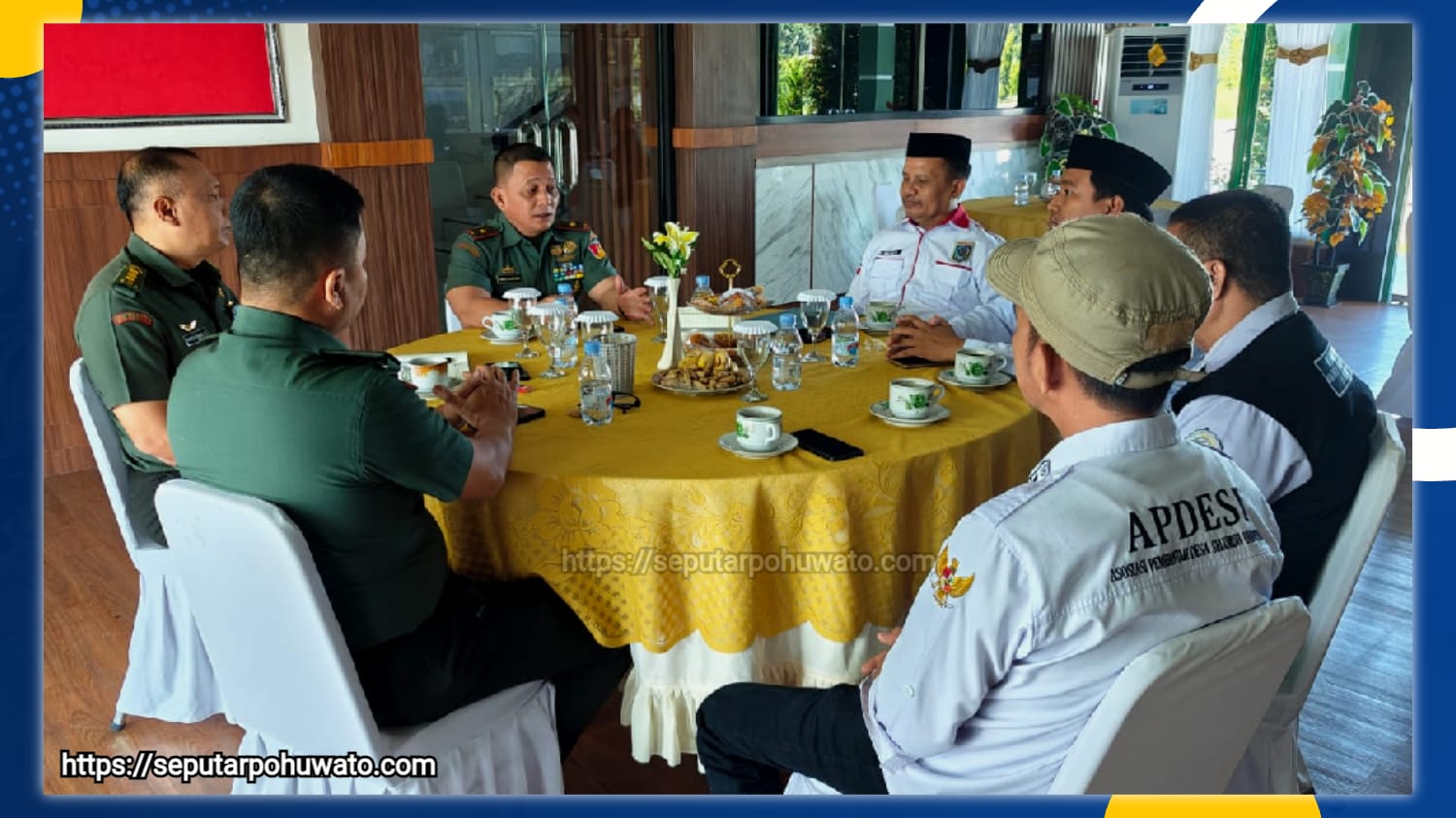 Hadir dalam pertemuan itu antara lain Ketua DPD APDESI MP Prov. Gorontalo Abdul Muis Hilala, Ketua Kompakdesi Prov. Gorontalo Ismail Gobel, Ketua DPC APDESI MP Kab. Gorontalo Ramli Lausupu, Sekertaris DPC Kab. Gorontalo Sandra Jafar Biu, serta jajaran Korem 133/NW termasuk Kasrem Kolonel Inf Parsaoran Sirait dan para Kasi.