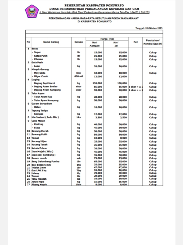 SEPUTARPOHUWATO.COM – Pemerintah Kabupaten Pohuwato melalui Dinas Perindustrian, Perdagangan, Koperasi dan UKM (Disperindagkop UKM) kembali merilis data perkembangan harga rata-rata kebutuhan pokok masyarakat per tanggal 20 Oktober 2025.