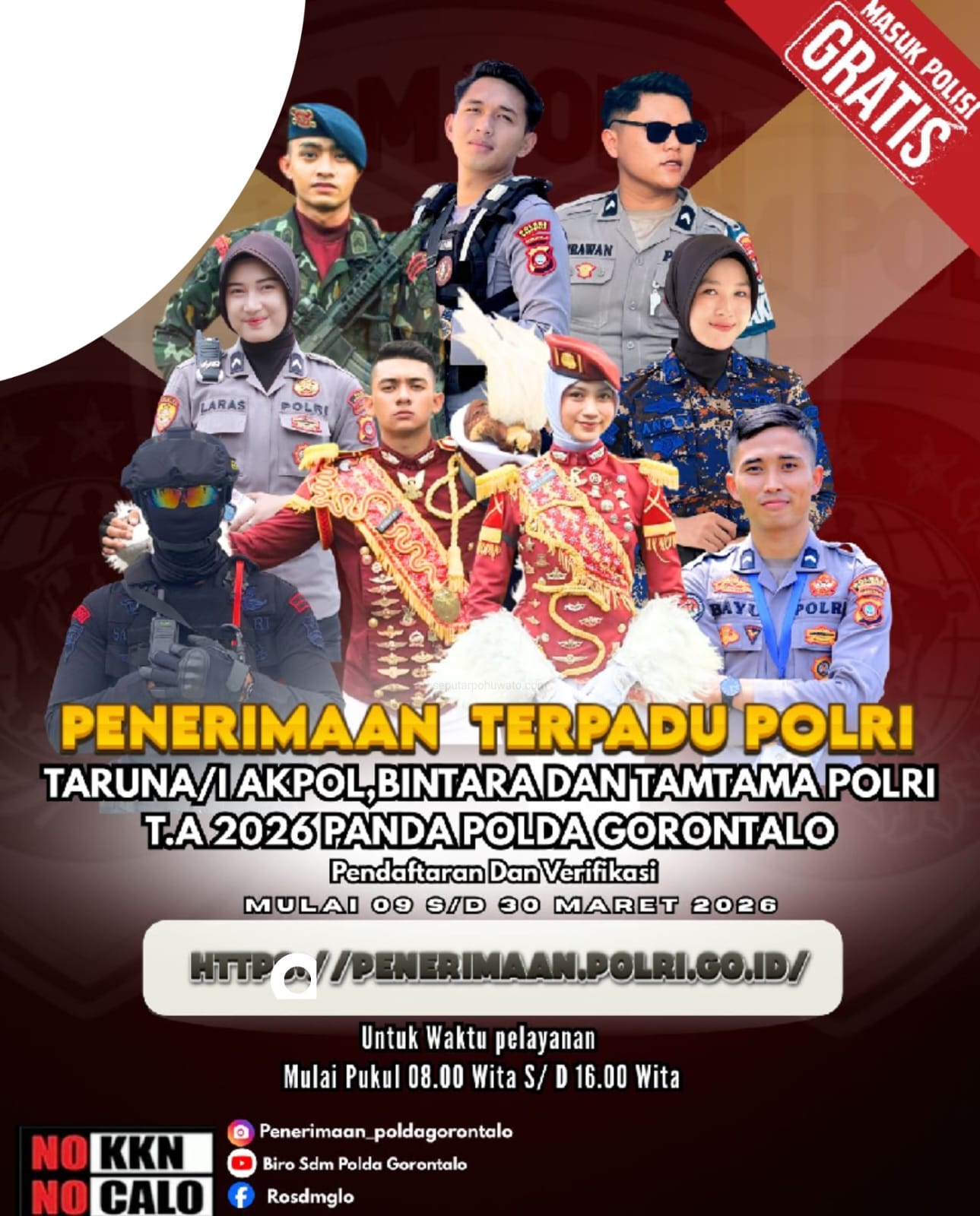 SEPUTARPOHUWATO.COM – Kepolisian Negara Republik Indonesia (Polri) resmi membuka penerimaan anggota Polri Tahun Anggaran 2026. Untuk wilayah Panitia Daerah (Panda) Polda Gorontalo, proses pendaftaran hingga verifikasi berkas berlangsung mulai 9 Maret hingga 30 Maret 2026.