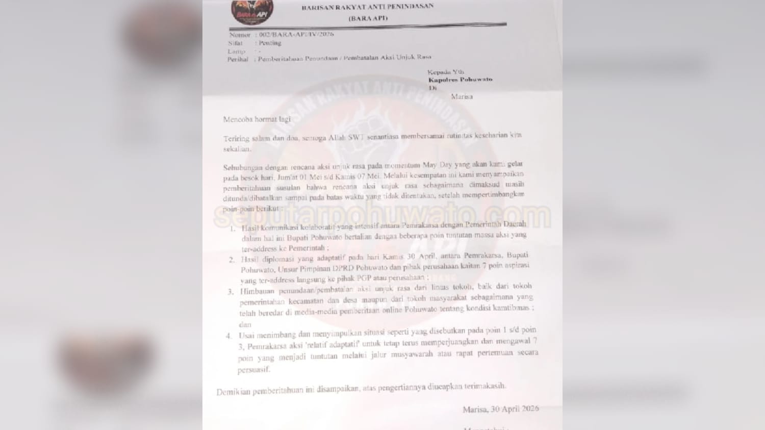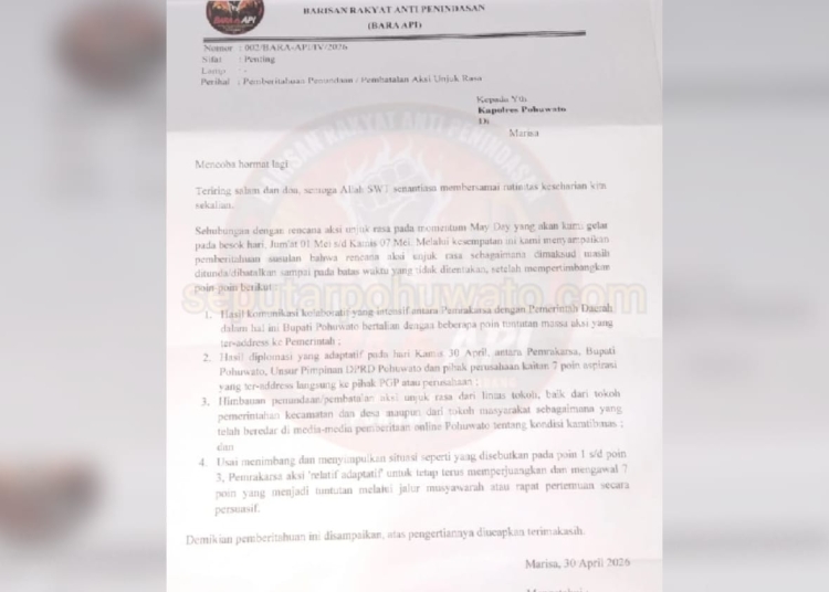 SEPUTARPOHUWATO.COM – Rencana aksi unjuk rasa yang sedianya digelar Barisan Rakyat Anti Penindasan (BARA API) pada momentum Hari Buruh Internasional atau May Day resmi dibatalkan.