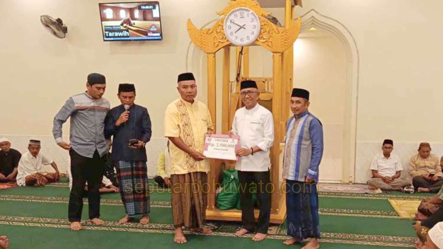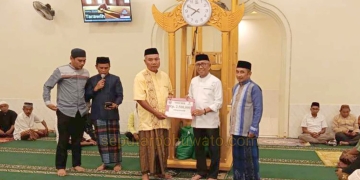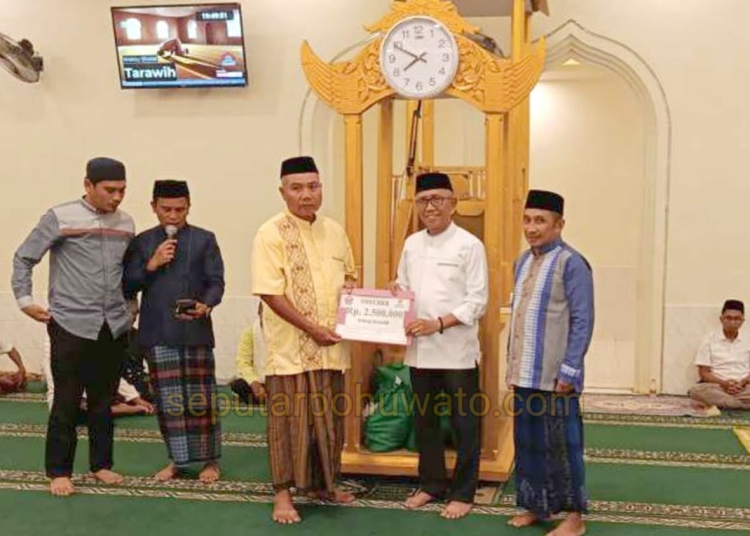 Penyerahan bantuan itu berlangsung usai salat Isya dan tarawih berjemaah di Masjid Besar Baiturrahman Kecamatan Paguat, Sabtu (28/02/2026). Selain paket Ramadan yang diinisiasi Baznas Pohuwato, Wabup Iwan juga menyerahkan voucher infak untuk masjid setempat.