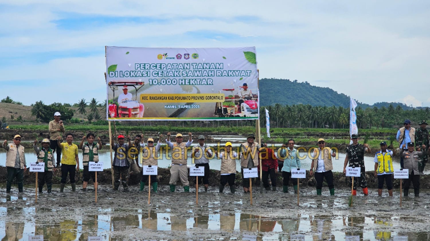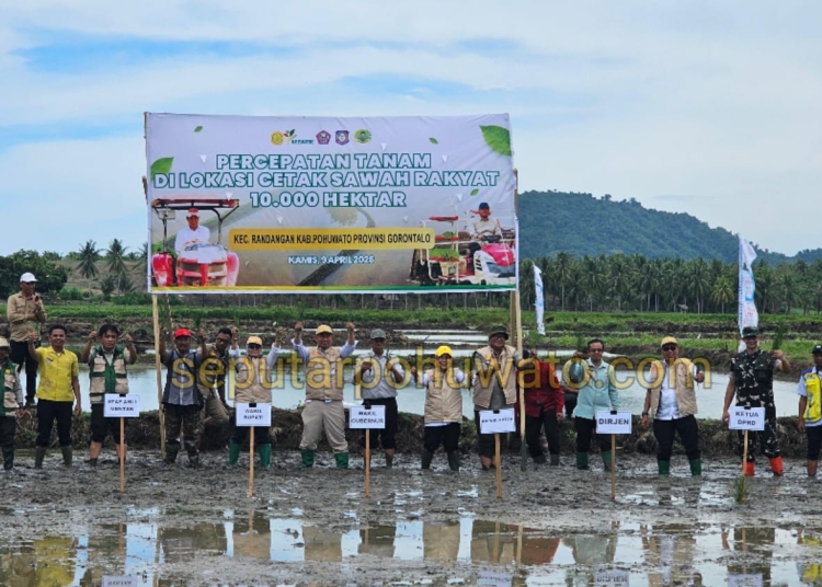 SEPUTARPOHUWATO.COM – Program percepatan tanam padi skala besar resmi dimulai di Kabupaten Pohuwato, Provinsi Gorontalo. Penanaman dilakukan secara serentak dengan target mencapai 10.000 hektar di lokasi cetak sawah rakyat Desa Motolohu Selatan, Kecamatan Randangan, Kamis (09/04/2026).